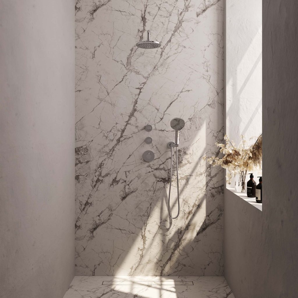 BRAUER Chrome Carving thermostatische inbouw regendouche SET 09 met 20 cm douchekop en gebogen muurarm en 3-standen handdouche en doucheslang en wandaansluitbocht chroom