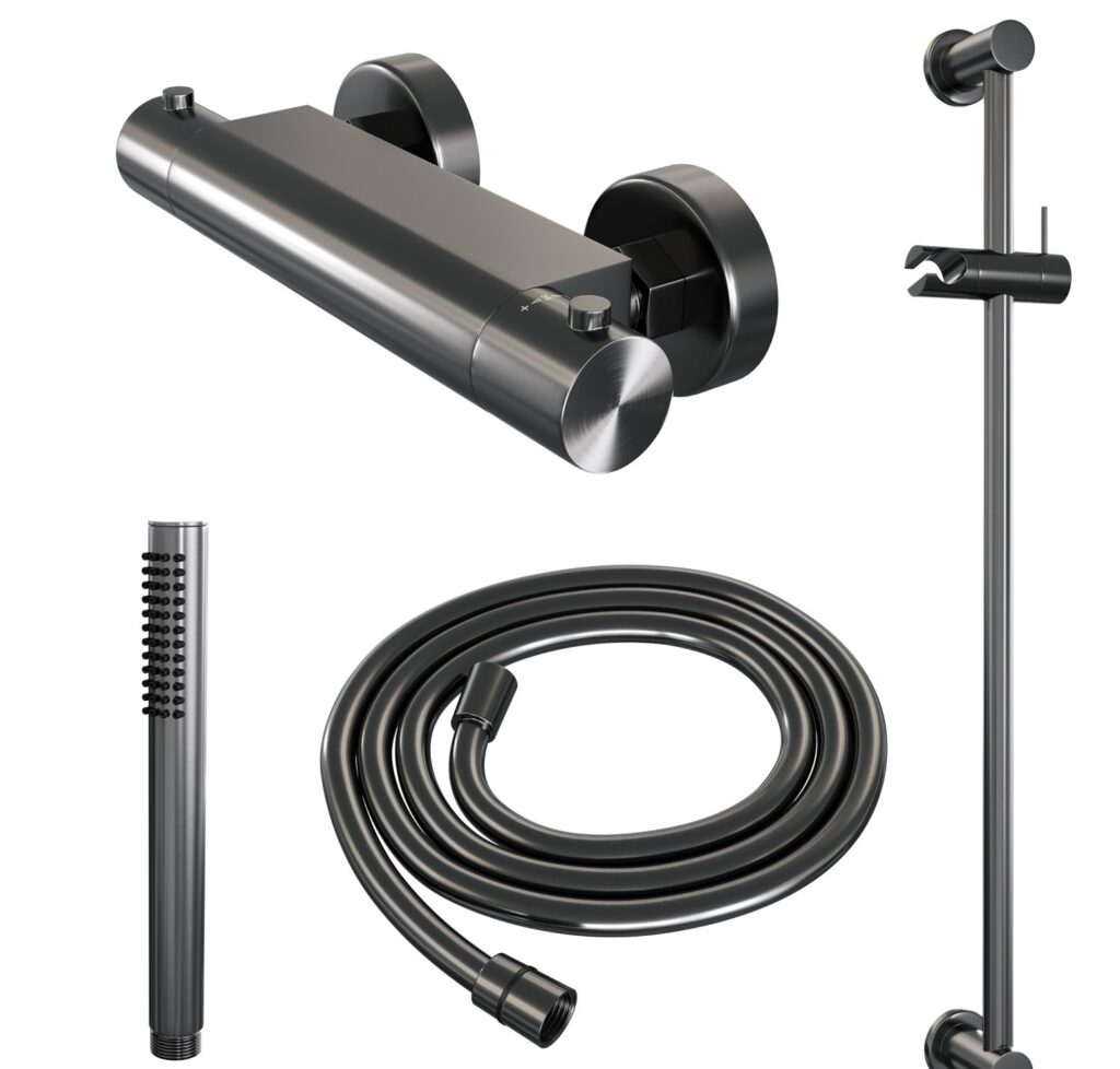 Met deze doucheset uit de Gunmetal Edition serie van Brauer ben je in één keer klaar met het kopen van jouw douche. De set bestaat uit een thermostatische kraan, doucheslang, glijstang met wateraansluiting en met staafhanddouche. Door de glijstang is de handdouche in hoogte te verstellen, ideaal met lengteverschil binnen je gezin!
