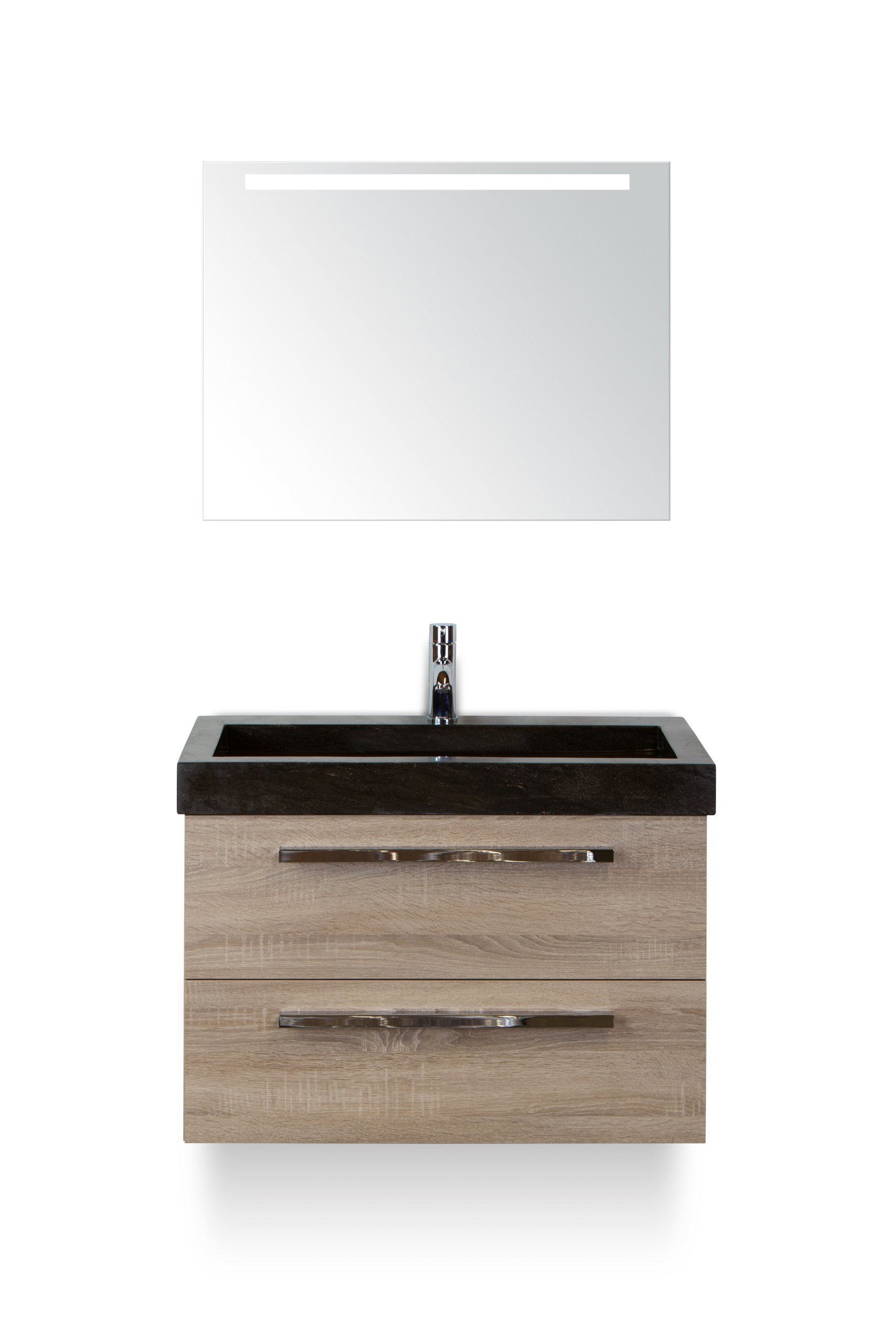 badmeubelset 80 cm breed - bestaande uit: wastafelkast 2 laden grijs eiken, hardstenen wastafel en spiegel met één horizontale verlichtingsbalk (LED)