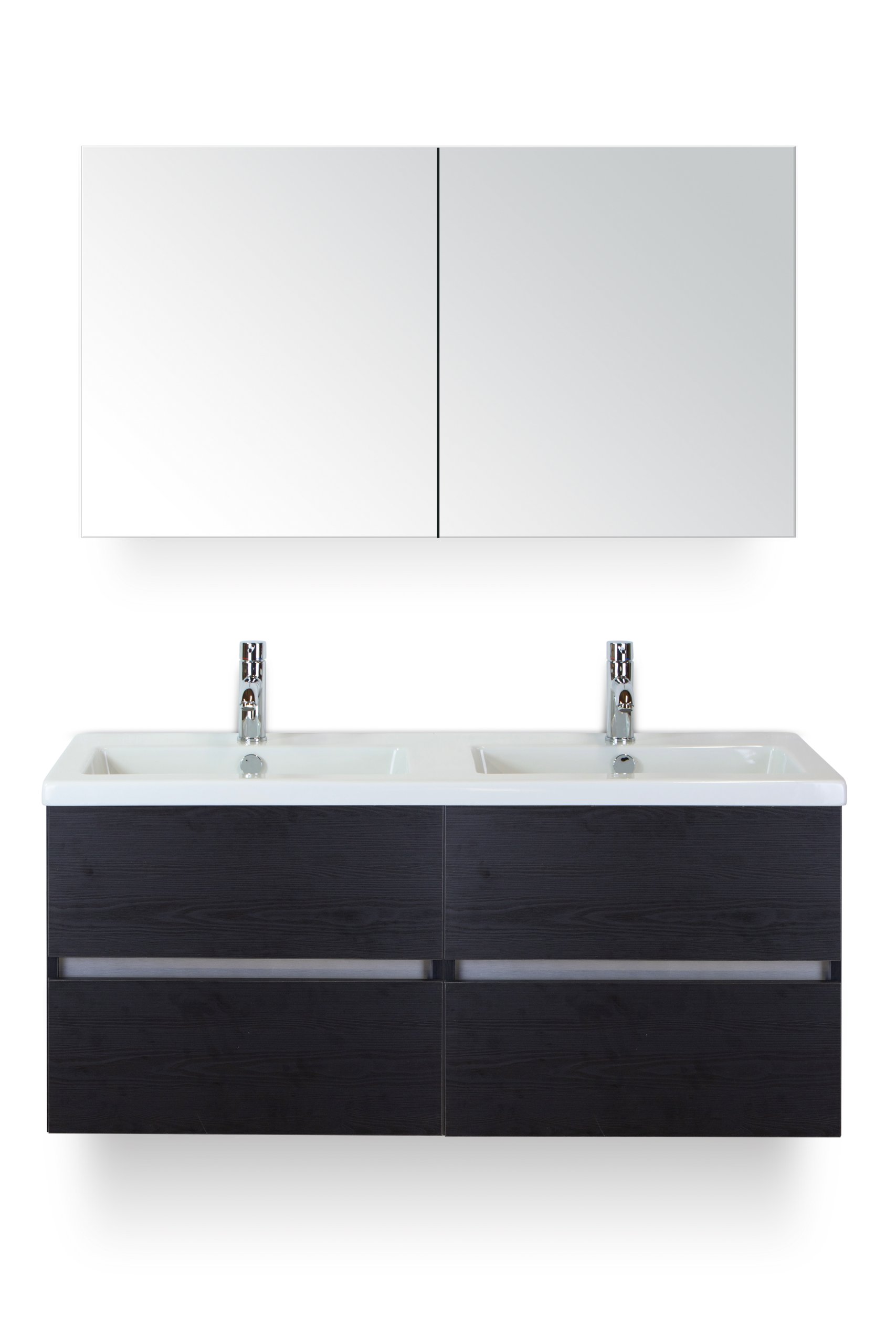 badmeubelset 120 cm breed - bestaande uit: wastafelkast 4 laden greeploos black oak, dubbele keramische wastafel Djazz en spiegelkast