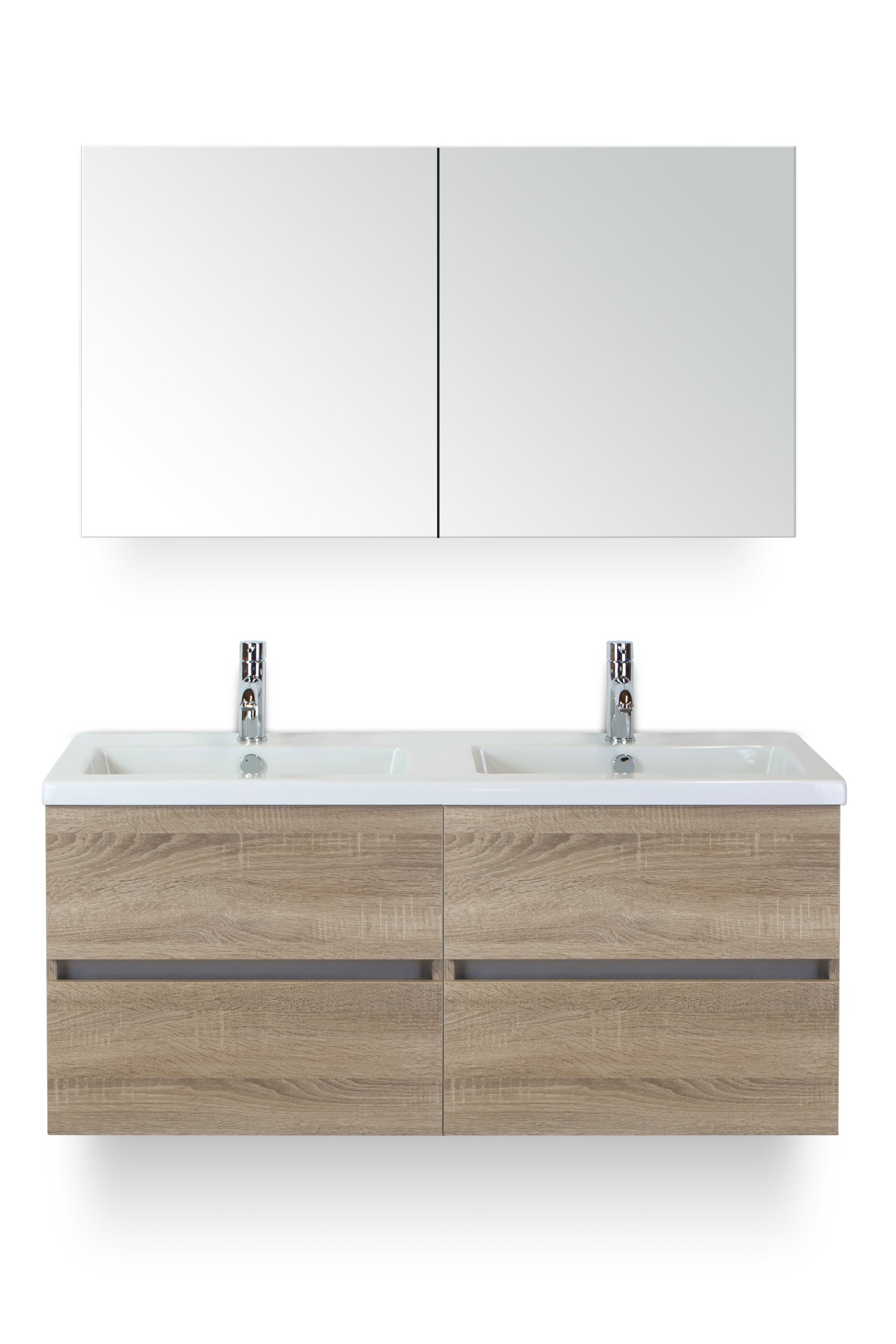 badmeubelset 120 cm breed - bestaande uit: wastafelkast 4 laden greeploos grijs eiken, dubbele keramische wastafel Djazz en spiegelkast