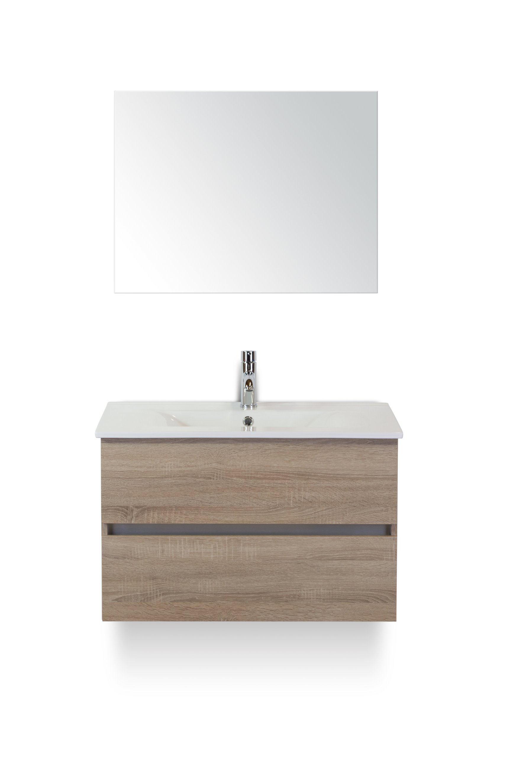 badmeubelset 80 cm breed - bestaande uit: wastafelkast 2 laden greeploos grijs eiken, keramische wastafel Enjoy en spiegel
