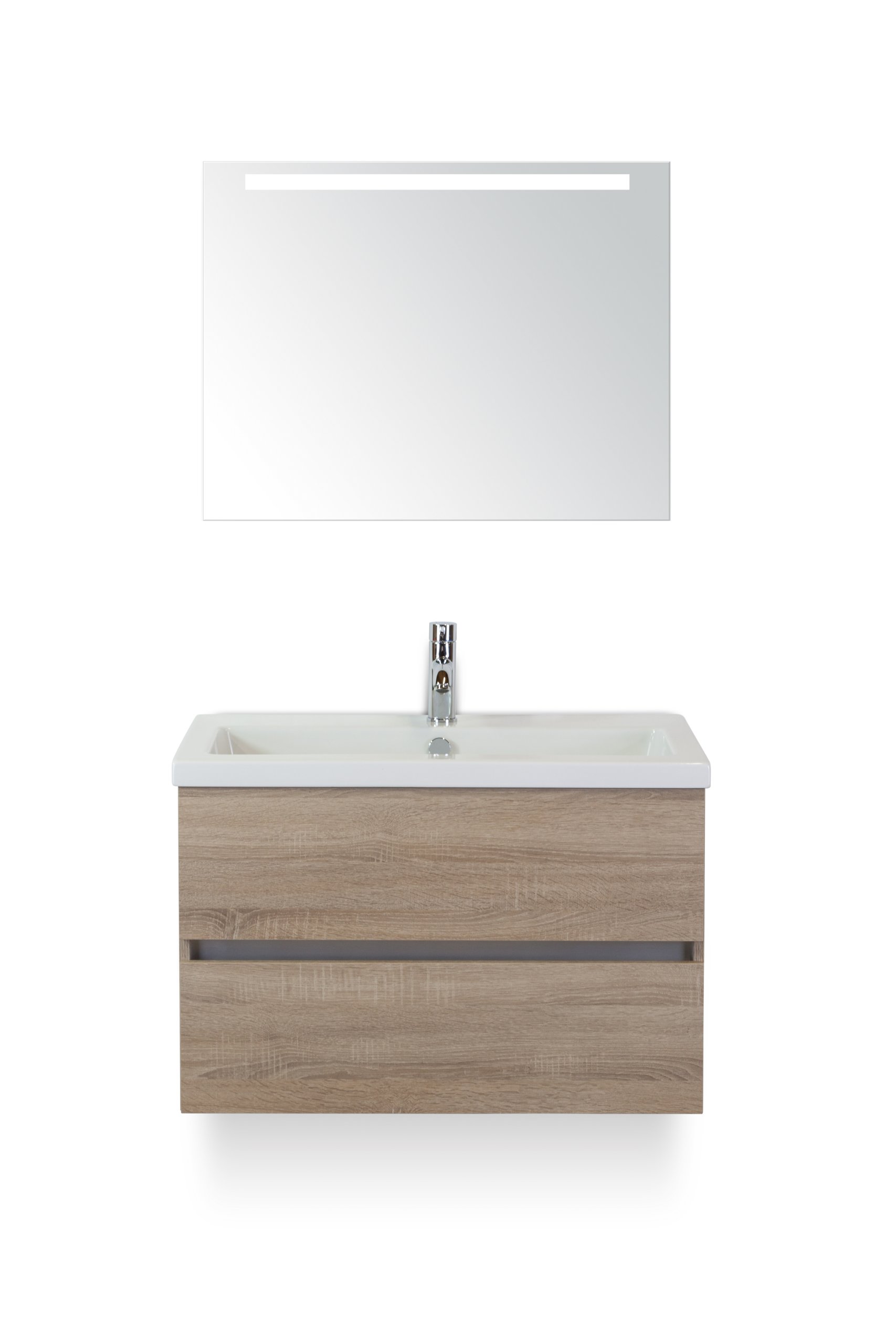 badmeubelset 80 cm breed - bestaande uit: wastafelkast 2 laden greeploos grijs eiken, keramische wastafel Djazz en spiegel met één horizontale verlichtingsbalk (LED)