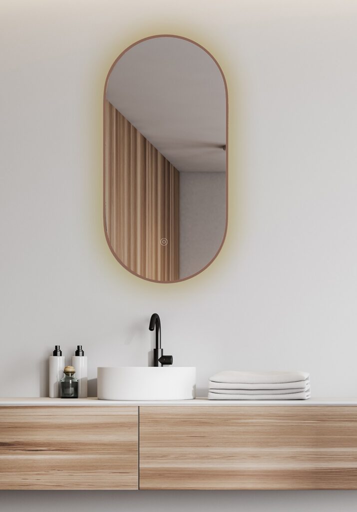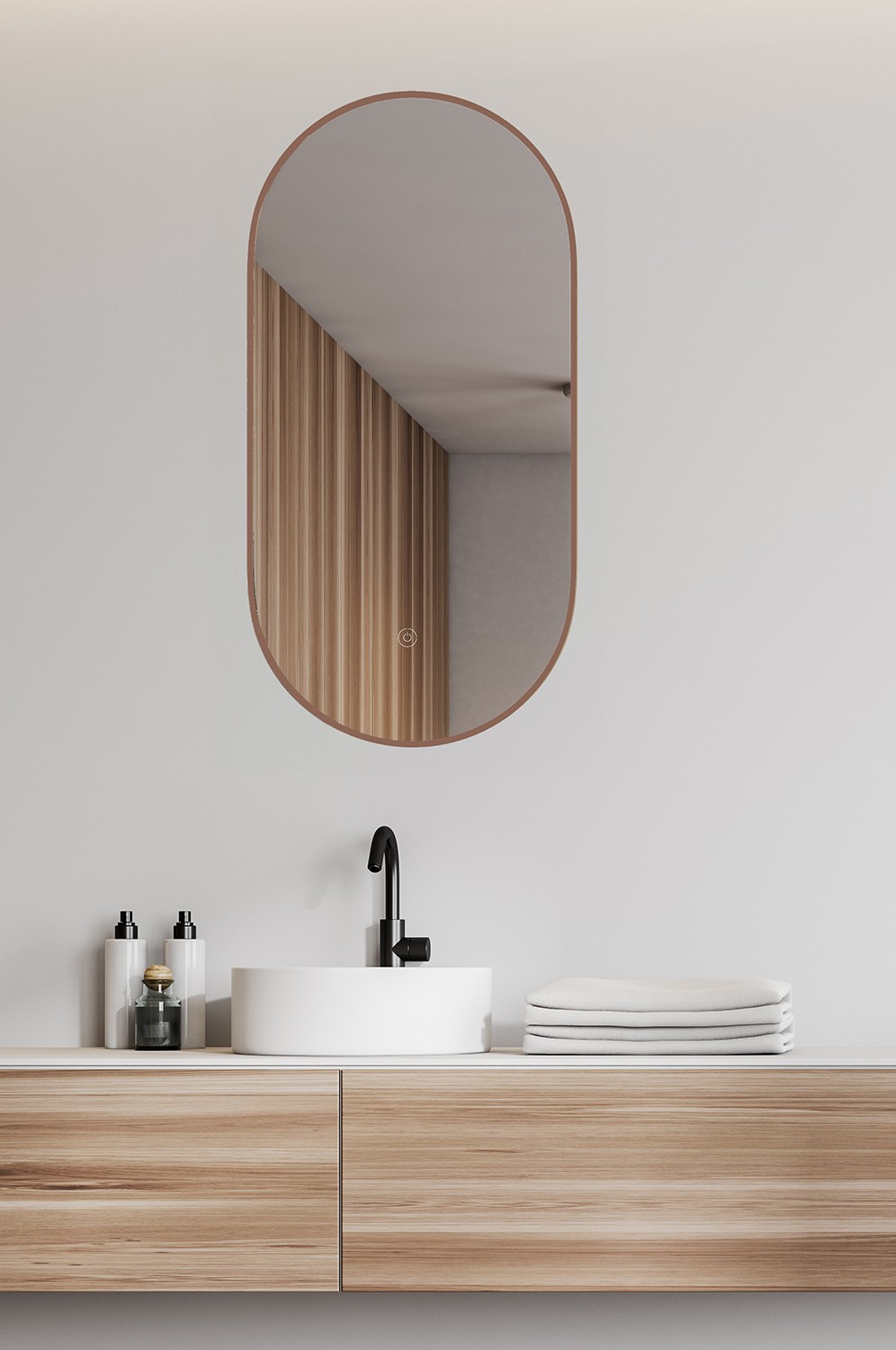 Wiesbaden Nomi spiegel met LED, dimbaar en spiegelverwarming 50×100 cm geborsteld brons koper