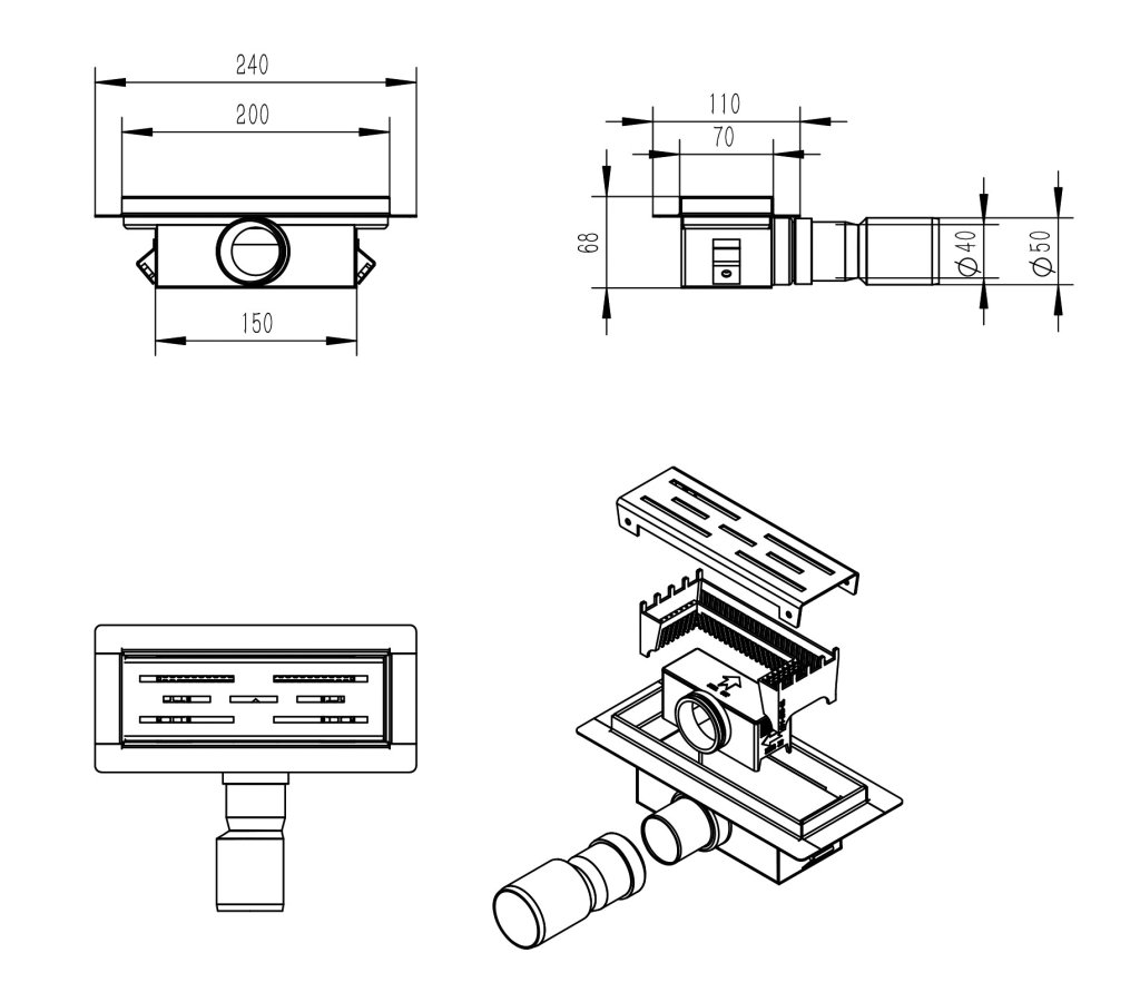 Xellanz Eco douchegoot met flens en rooster 20 x 7 cm RVS