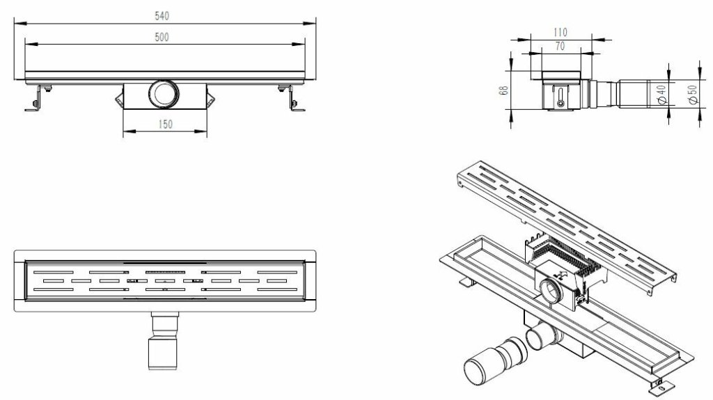 Xellanz Eco douchegoot met flens en rooster 50 x 7 cm RVS
